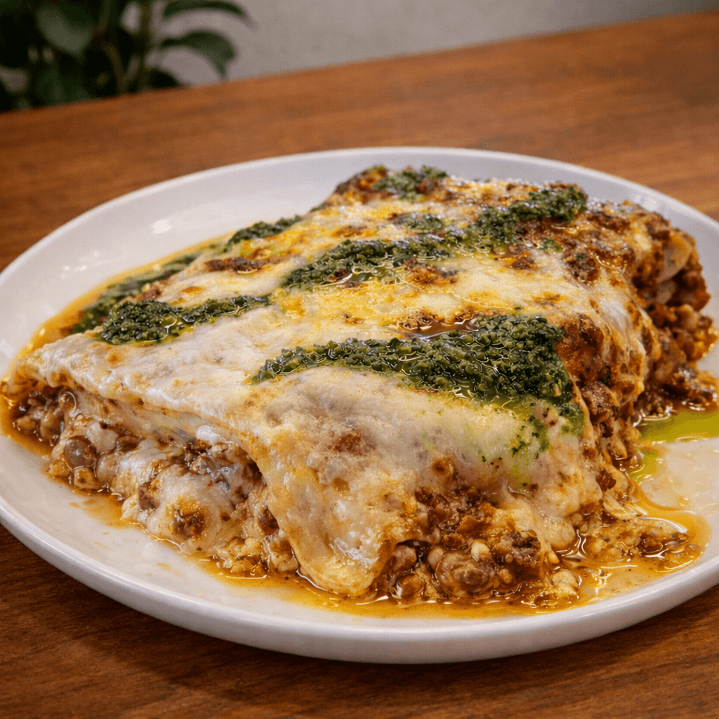 Clásico pasticho casero con capas de pasta, carne y salsa gratinada al horno.