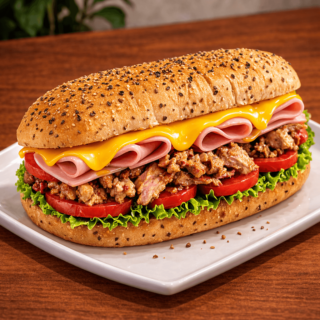 Pan campesino con toque de orégano, relleno de pernil jugoso, jamón y queso amarillo, acompañado de vegetales frescos y salsa al gusto. Un sándwich abundante y lleno de sabor.